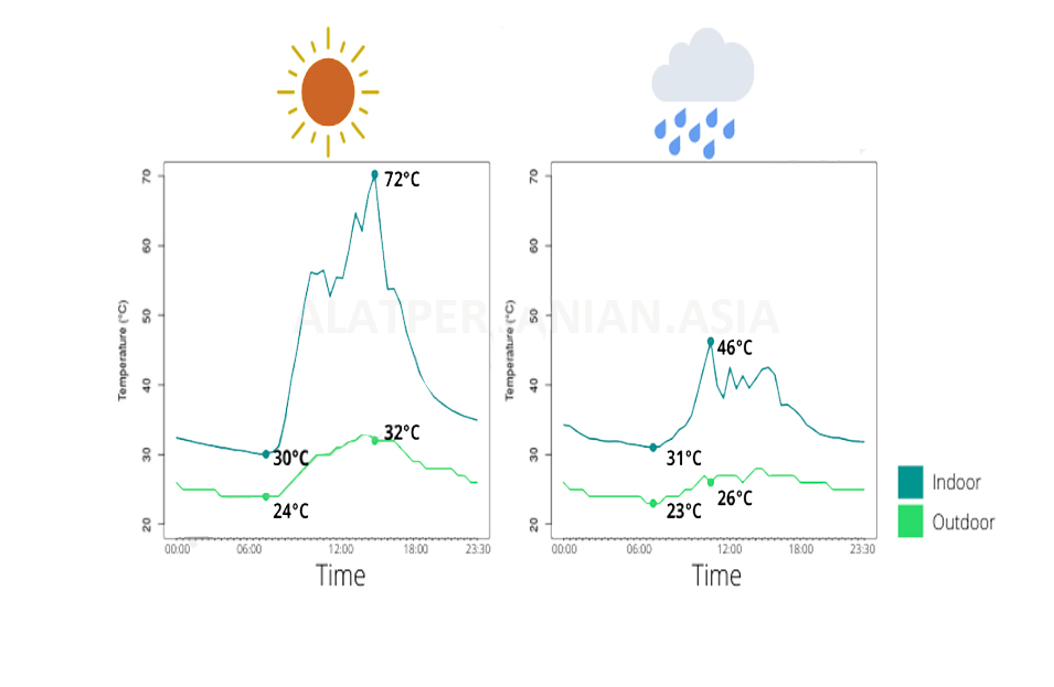 Hari hujan tidak cocok untuk mengeringkan cabe. Tapi, kita masih bisa mengeringkan tomat dengan menggunakan pengering tenaga surya rumah kaca. Pengering surya rumah kaca dapat menahan panas hingga maksimum 46 ° C dibandingkan dengan suhu luar hanya 26 ° C.