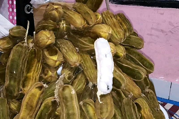 Buahnya berbentuk polong, berusuk membujur atau bergerigi, dapat berupa garis lurus, melengkung, atau sering kali berbelit secara spiral, berwarna cokelat kekuningan hingga hijau. Di dalam polong tersebut terdapat biji berwarna hijau yang dikelilingi oleh daging buah yang lembut dan manis, mirip dengan tekstur kapas, berwarna putih.