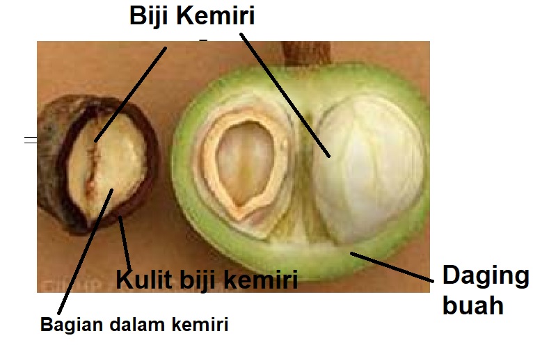 Bijinya termasuk buah batu karena berkulit tebal dengan permukaan luar yang kasar. Tempurung biji mempunyai ketebalan antara 3‐5 mm dengan warna kecoklatan atauhitam. Biji kemiri memiliki bentuk limas, agak gepeng dengan salah satu ujung meruncing.
