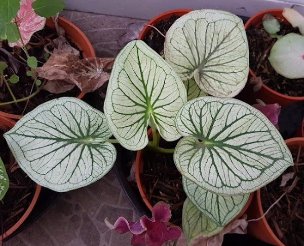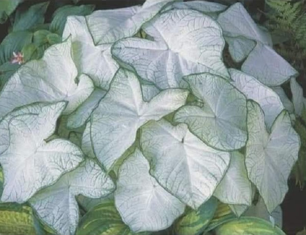 Tanaman keladi ini menampilkan daun yang hampir sepenuhnya berwarna putih bersih, mirip dengan cahaya rembulan. Daunnya memiliki garis-garis hijau yang menarik, dan tepi daunnya juga cantik dengan warna hijau yang memikat.